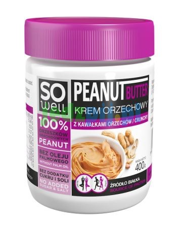 Krem orzechowy SoWell Crunchy zawiera wiele cennych składników, które pozytywnie wpływają na funkcjonowanie naszego organizmu. Jest ono bogatym źródłem białka roślinnego (25g w 100g). Jak powszechnie wiadomo, białko jest ważnym budulcem masy mięśniowej, dlatego jest głównym składnikiem diety osób aktywnych fizycznie i sportowców.