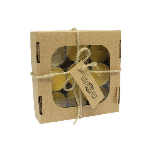 Zestaw podgrzewaczy z wosku pszczelego w kolorze naturalnym zapakowane w ozdobne pudełko po 9 sztuk.